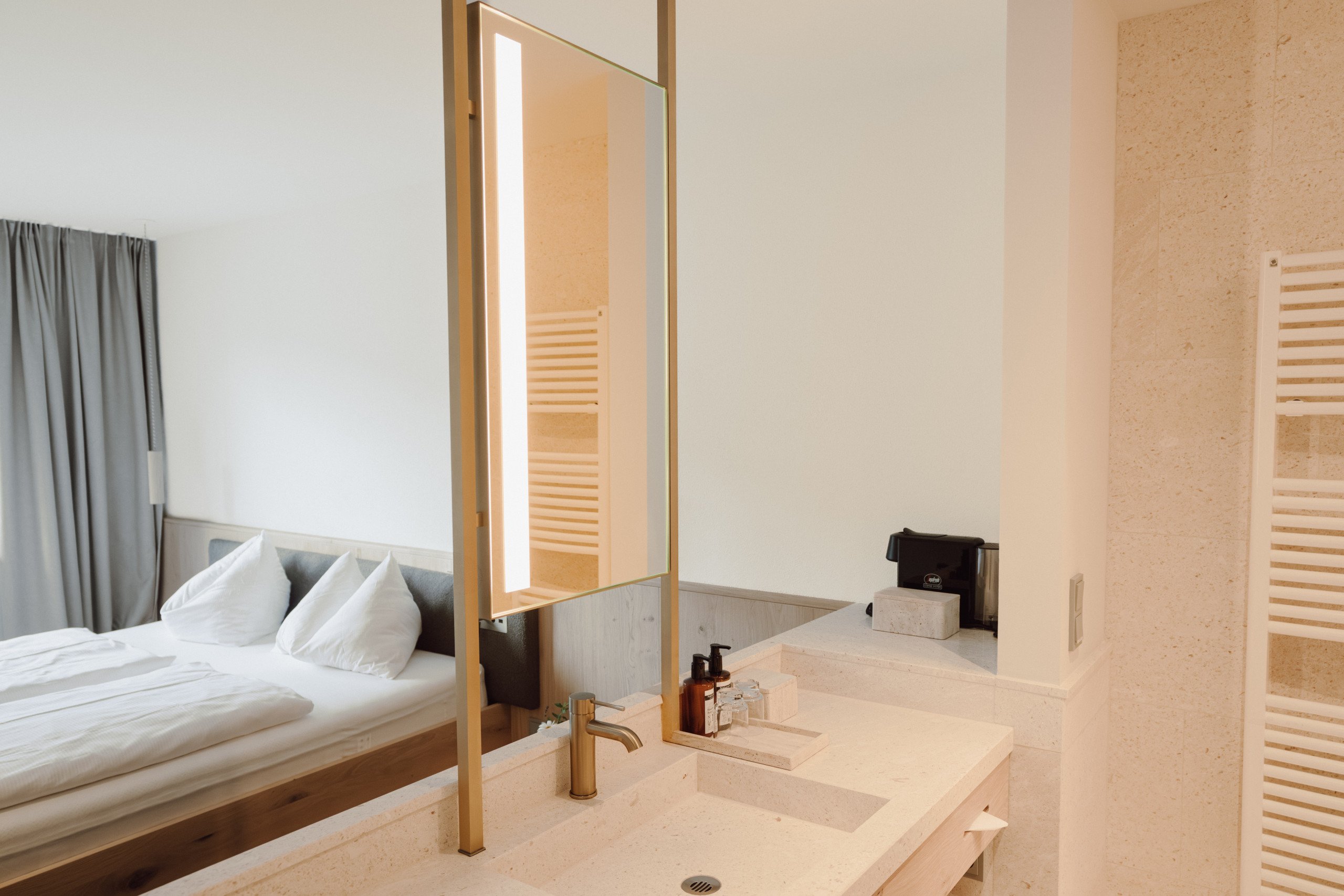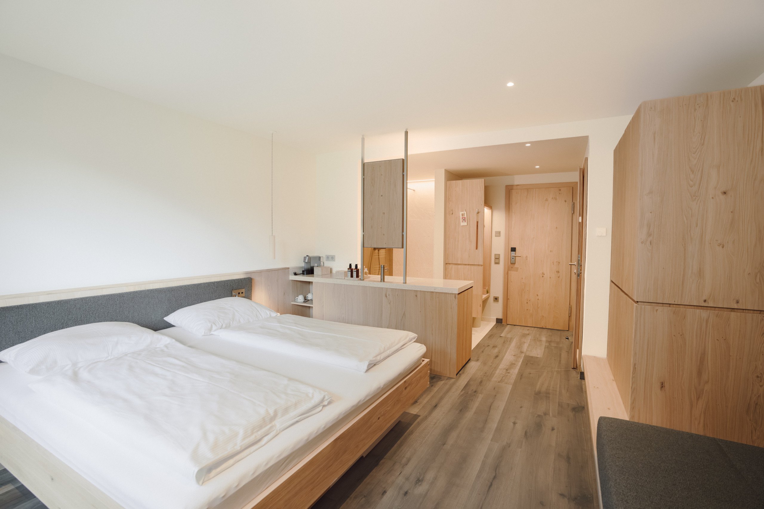Cozy double room with spacious double bed, natural wood flooring, elegant seating area, private and furnished balcony with morning sun, Wi-Fi, in-room safe, coffee machine, mini fridge, smart TV, open-plan bathroom with natural stone, shower, hairdryer, heated towel rack, separate WC