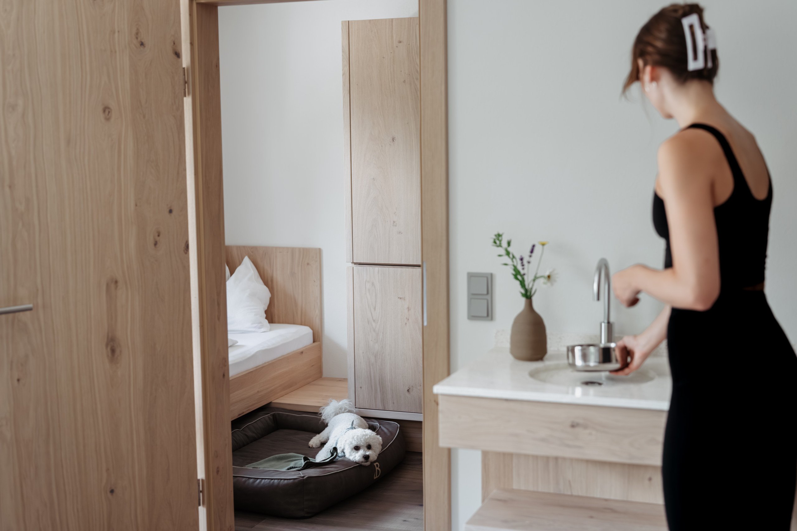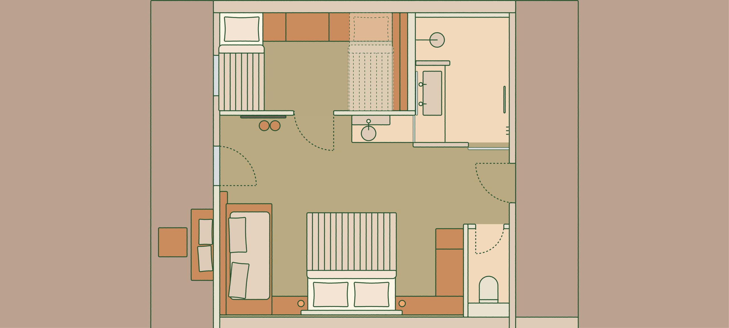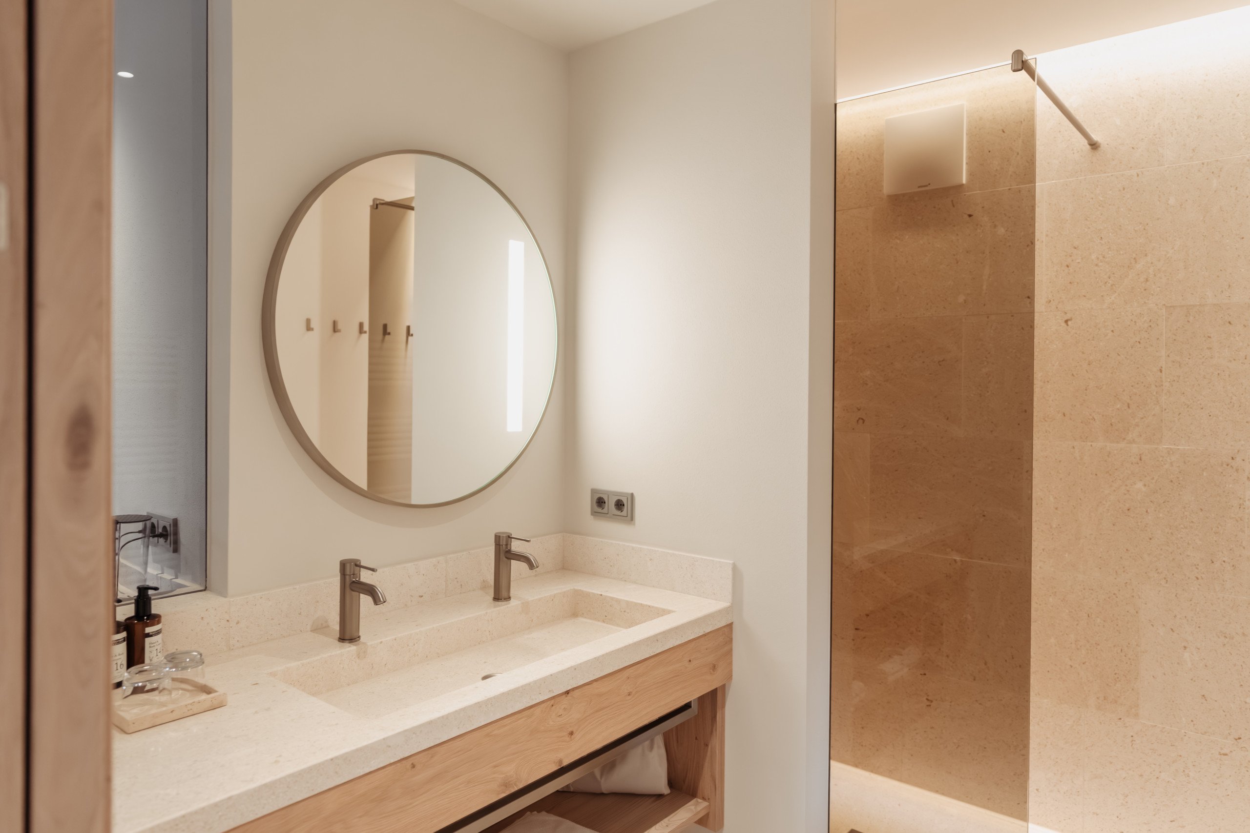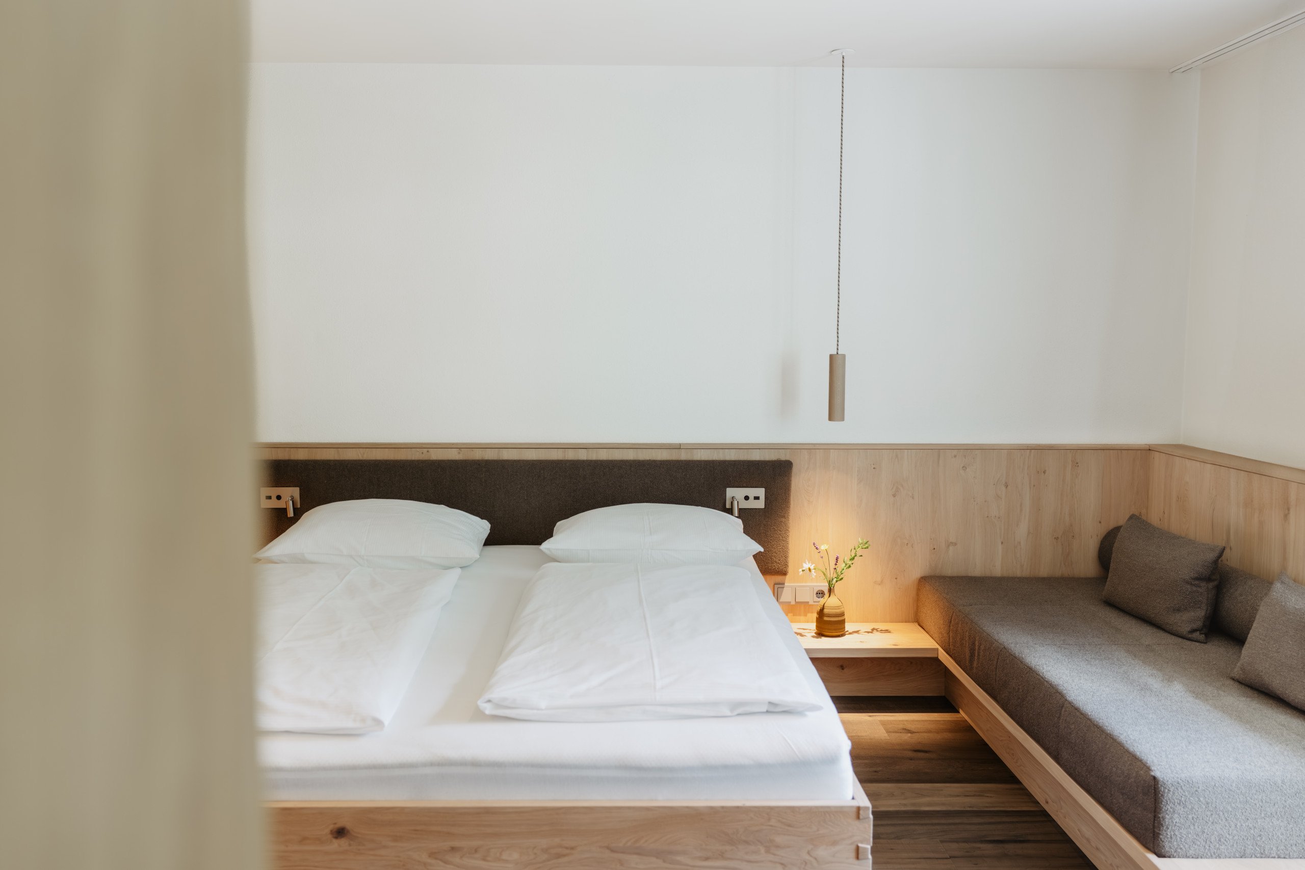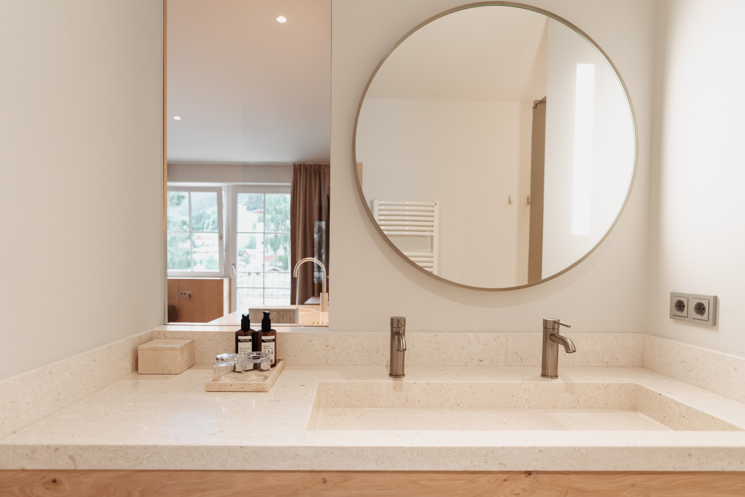 Spacious, newly designed Bergzeit Suite with additional twin bedroom (1x large double bed, 1x single or twin beds), natural wood flooring, cozy seating area, private and furnished balcony with mountain view, Wi-Fi, in-room safe, smart TV, mini fridge, fresh water fountain, coffee machine, large modern bathroom with natural stone, shower, double washbasin, separate WC, hairdryer, heated towel rack