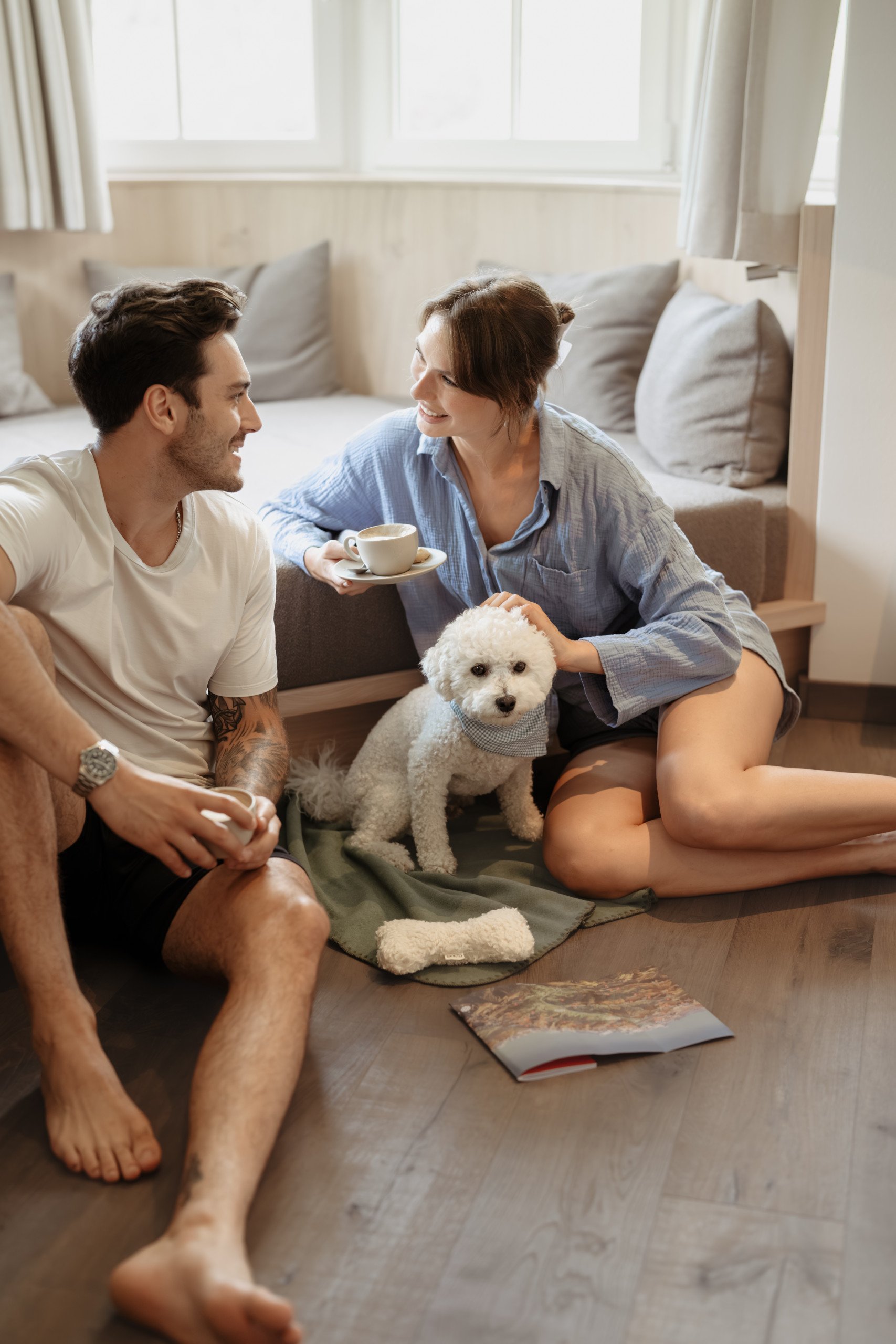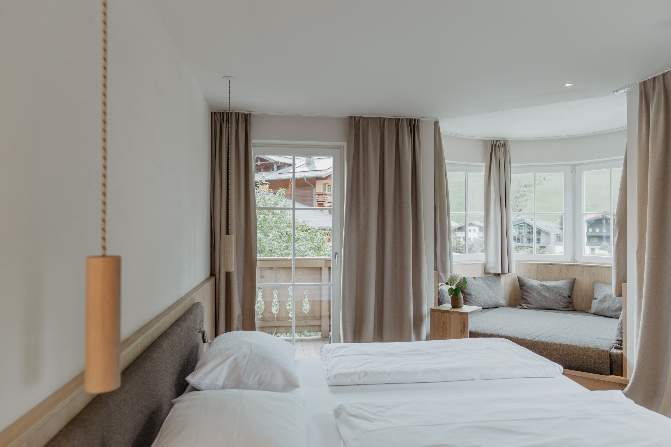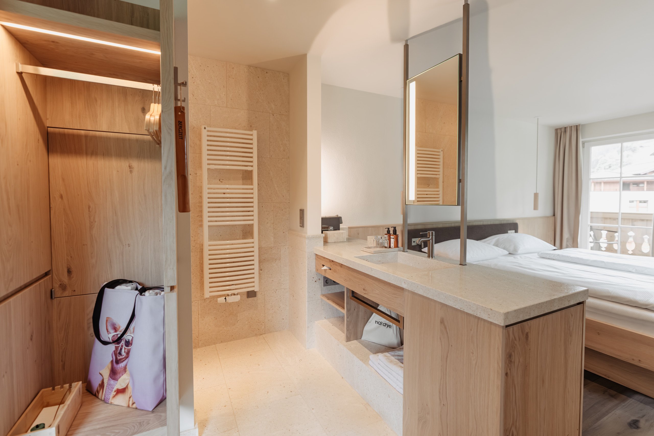 Bright panorama suite, spacious double bed, natural wood flooring, cozy relaxation area in the bay window tower with stunning mountain views, private and furnished balcony, Wi-Fi, in-room safe, smart TV, mini fridge, coffee machine, open-plan bathroom with natural stone, shower, separate WC, hairdryer, heated towel rack.